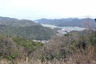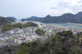 | さっそく急な登りになり、山登りの体になっていないので結構厳しい。15分ほどで愛宕神社に到着、神社の前から日本海、丹後半島、円山川そして城崎温泉街が眼下に広がって見える。 |