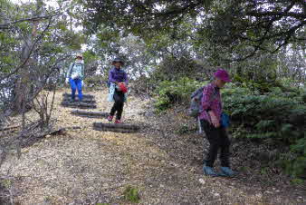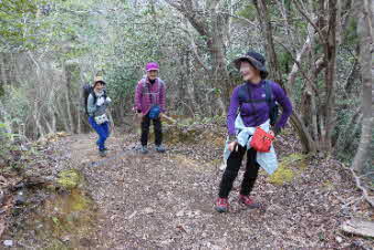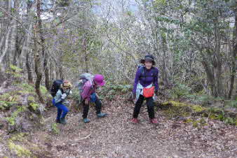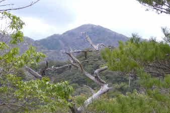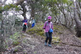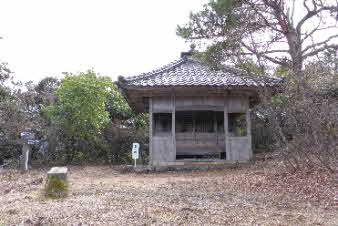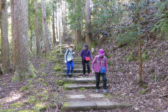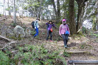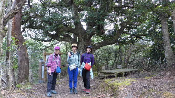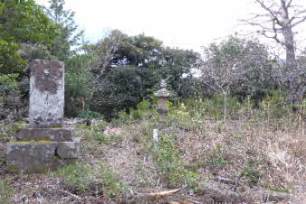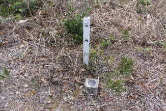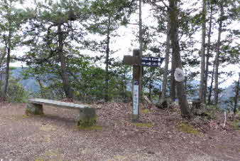 | 登山口から50分ほどで大師堂跡に到着。灯篭や石碑が少し残ったお堂あとで、四等三角点になっている。ここからさらに20分ほど進むと、大きな樹がある。 |