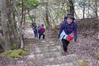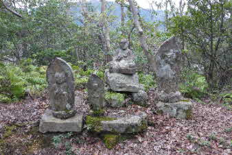 | 大師山ハイキングコースには、四国八十八ヶ所巡りとして親しまれ、たくさんの石仏が祀られている。そんな石仏の尾根道を進めていく。やがて木々の間から来日岳が見えてきた。来日岳の登山道にも多くの古い石仏、お地蔵さまだったと思うが祀られていた。 |