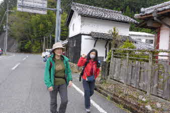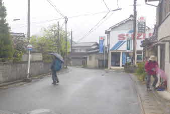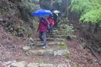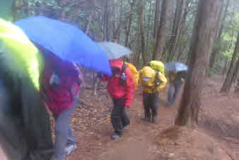 なんとか悪路を下りきると、動物よけフェンスがあり、右手に宮川神社がある。さらに下って行くとやがてゴールの宮川BSに全員無事下山した。民家の軒下をお借りして、雨具を脱いだりしてバスを待った。 |