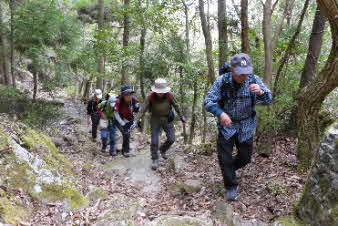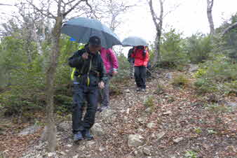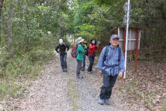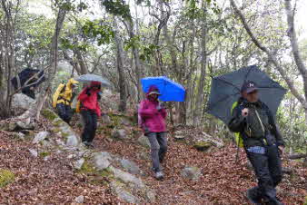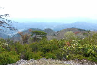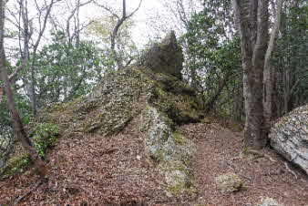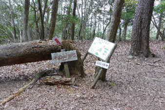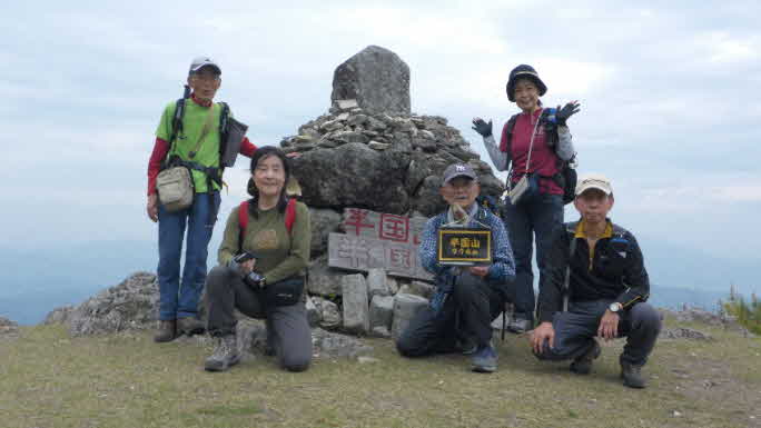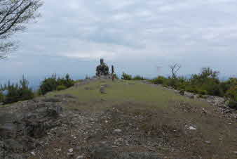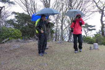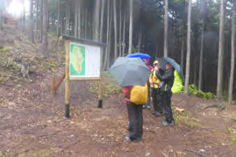 早速、記念写真を撮って、昼食にした。今日の天気予報は3時頃から小雨の予報だったが12時半頃から小雨が降り始めた。半国山の名になったという、三国の展望は今ひとつだった。天気が良ければ三国の播磨、丹波そして摂津の国を眺めることができたかも次回に譲ろう。 |