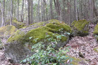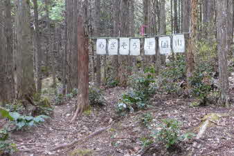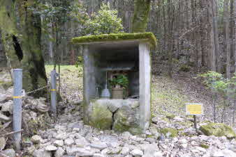 先に進むと、周囲の樹林が美しい。よく整備された公園のような樹林で、地元の人が付けた案内の一言も面白い。林道終点に着くと地蔵尊がある。 |