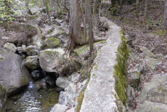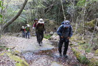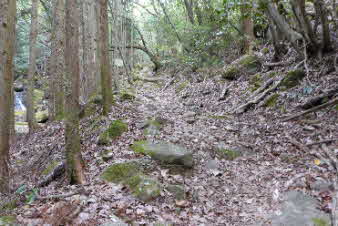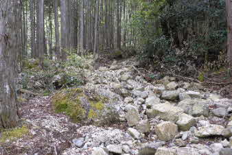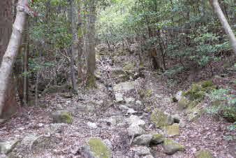 | 地蔵尊の右に山へと延びる林道がある。しかしながらこの林道は水害等で崩壊し、大きな石がごろごろとしたガレ場道になっている。案内によると、左側の沢側に沿ってピンクのテープがあるのでそれに沿って行けば歩きやすいとのことだ。 |