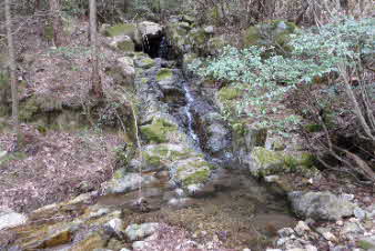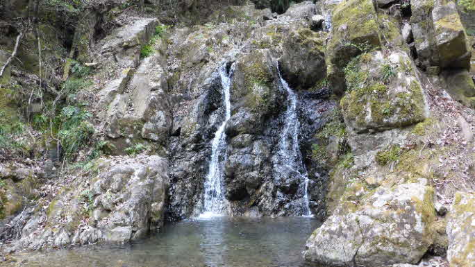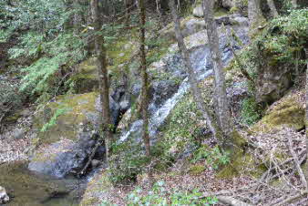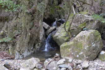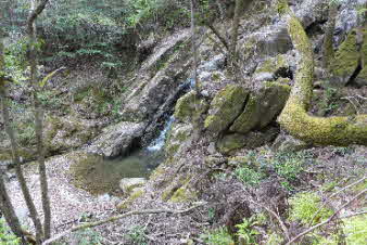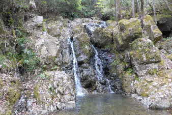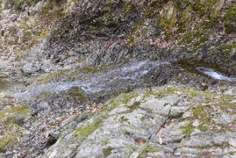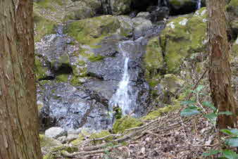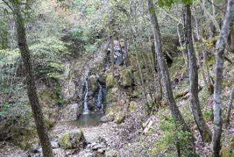 | 渓谷を眺めながら登っていく。やがて滝が下に見えてくる。音羽の滝だ。斜面を降りて沢から滝を眺めた。水量が少ないのでそんなに迫力はないが美しい滝だ。 |