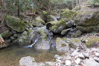 | 音羽渓谷をどんどん登っていく。やがて登りが少し急になると、尾根が見えてきて鞍部に到着だ。鞍部の案内では牛つなぎ広場となっていた。今登ってきた壊れた林道は生活堂だったのだろうか。この鞍部の先はるり渓につながっていたようだ。 |