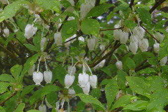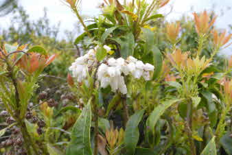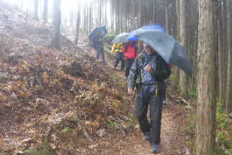 小雨も長くいると辛い、山頂のアセビも涙を流し始めたので下山することにした。宮川を目指して下り始めるがかなり厳しい斜面の下りで滑りそうで注意しながら降りる。