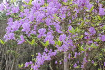 るり渓分岐まで下ると緩やかな尾根道になる。分岐には霧の中にミツバツツジが美しく咲いていて元気をつけてくれた。 |