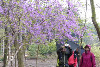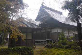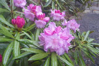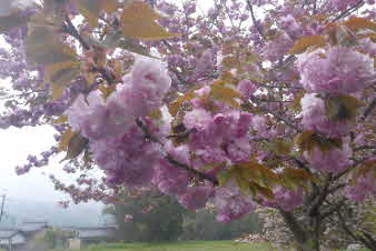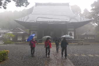 さらに下ると金輪寺裏に到着した。お寺にはシャクナゲがたくさん咲いていて疲れを癒やしてくれた。小雨のため下りは休憩もせずひたすら下ってきたので早く金輪寺到着。ここで雨宿りを兼ねて軒下をお借りしてしばらく休憩した。