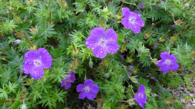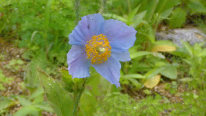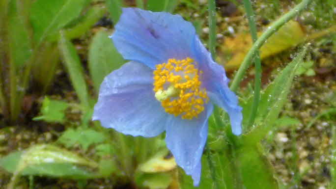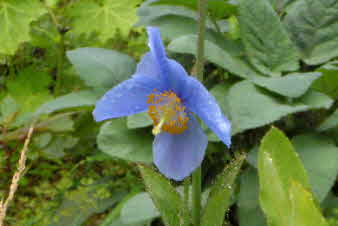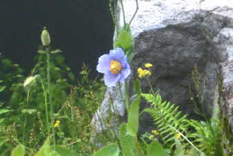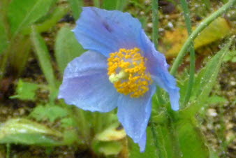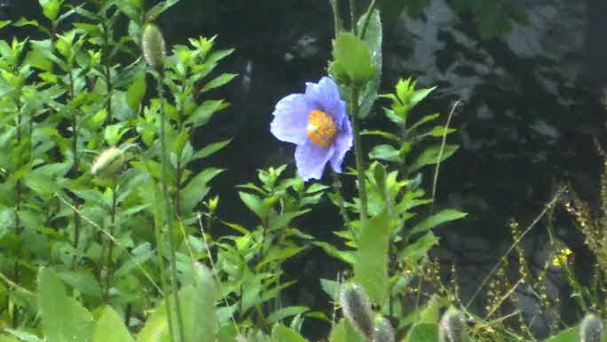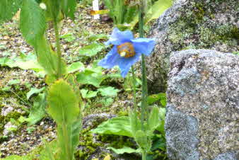 | まわりをよく見ると下の方に、青いケシが数輪咲いていた。回り込んでヒマラヤの青いケシにご対面。チョット旬が過ぎているので感動するほどの色合いではないがそれでも結構美しい。 |