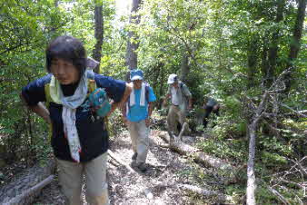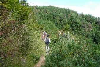 尾根道は、荒れ放題で倒木が前進を阻んでいる。倒木で頭を打っ付け頭が割れそうだ。そんな道をなんとか山頂へと頑張って登った。 |