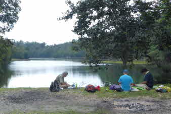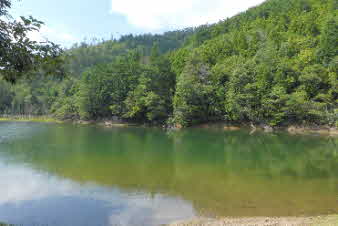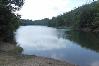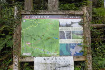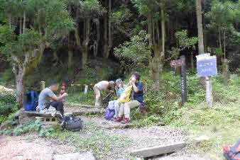 | 菩提道をさらに進むと、沢ノ池の分岐になり、約20分で沢ノ池に到着する。池は周囲の綠が映り込んで素晴らしく綺麗だ。昼食を山頂でと計画していたが池が美しいのでここで昼休みにした。 |