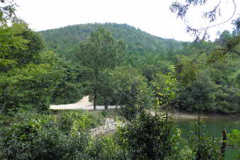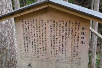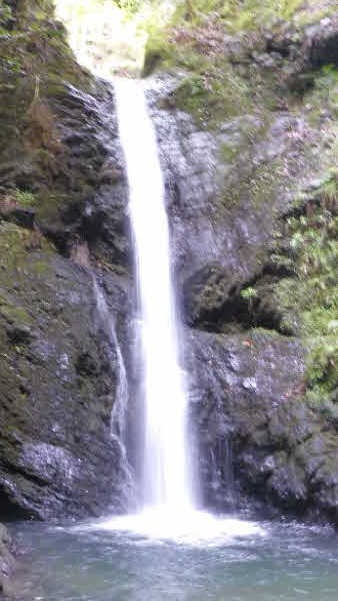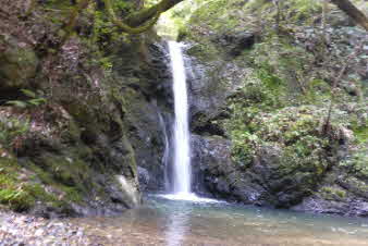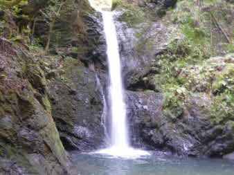 | 20分ほど歩くと、右手に菩提の滝の案内が出てくる。右の谷へと下って行く、河原に出て奥を覗くと滝が見える。美しい滝だ。しかし、滝上に道路のガードレールが目に入るのはつや消しだ。 |