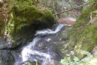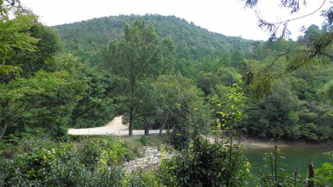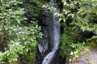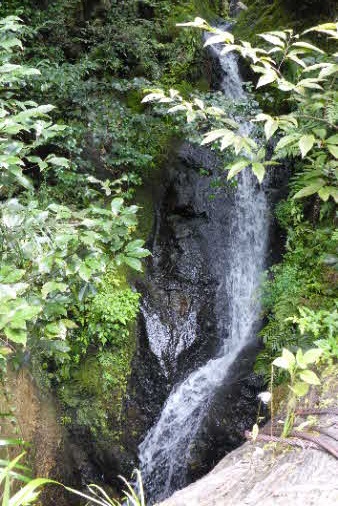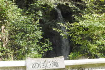 | 滝入口の道路に戻り、少し行くと、左側に「め(雌)滝」が木の葉っぱの間に見える。さらに進むと、菩提の滝の滝頭の上を通る。少し遠いので滝壺までは望めない。 |