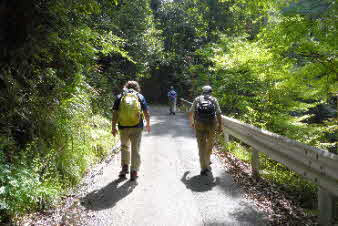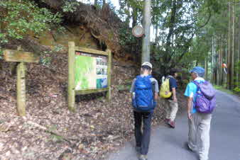 東海自然歩道の案内板の前で支度して出発、広い道を歩き始める。暑さを気にしていたがさほど暑くなく良い感じだ。