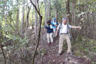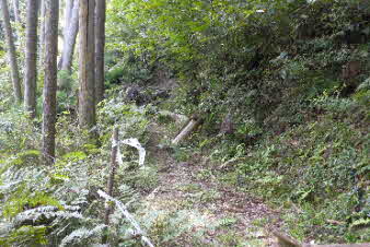 | 山頂をあとに、上ノ水峠へと下山開始した。登ってきた南側の尾根は倒木だらけだったが北側の峠に続く道は良く整備されている。 |