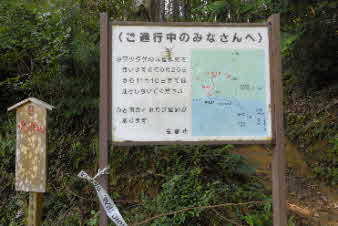| 下り終えるとお地蔵さんのある峠に到着する。ここで小休止して展望の良い斜面を進もうとしたら、斜面が崩落して大規模な崖崩れになっている。眼下にはなぎ倒された杉の木がぐしゃぐしゃに落ち込んでいる。仕方ないので遠回りして下ることにした。 |