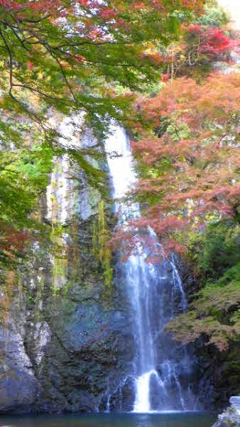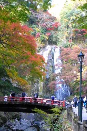 | 箕面大滝に近づくと紅葉が美しくなってきた。特にビジターセンター辺りから川沿いの紅葉が素晴らしい。駐車場辺りまで下ってくると、紅葉の海に猿が大ジャンプ、高い木で遊んでいる。 箕面大滝に到着、各々紅葉と滝を楽しんだ。素晴らしい、美しい紅葉と滝を楽しむことができた。大自然よありがとう。 |