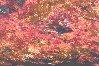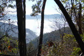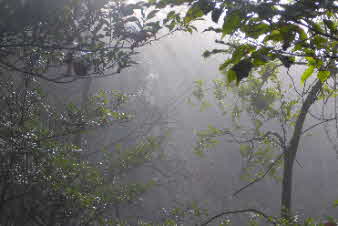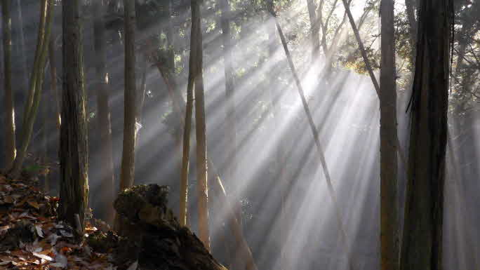 | しばらく登ると、木漏れ日がが実に素晴らしい。この辺りはまだ朝霧におおわれていると思うが、その朝霧に朝日が射して素晴らしい景色を創出しているようだ。 |