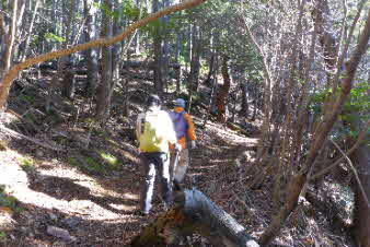 さらに進むと、明神峠への分岐で、右は崖くずれで通行止め、左に進む。送電線鉄塔の下をくぐり、左手を巻くと、分岐になり、右にとって進む。尾根を道なりに下ると、通行止めの反対側を通過する。 |