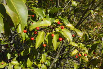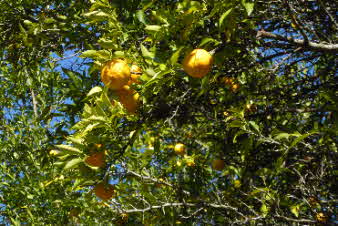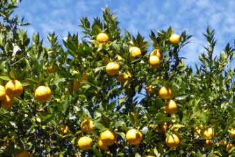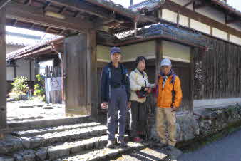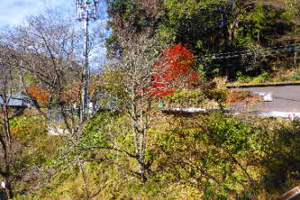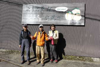 | たわわに実った柚子、赤い実の南天、赤く染まった紅葉など素晴らしい。歓迎看板の前で記念写真を撮って、まるげん(丸源)に向かう。 |