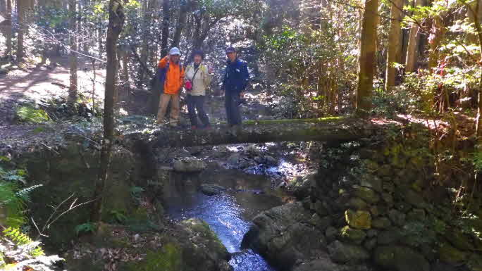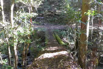 鉄塔を過ぎると、急な下りになり、注意しながら下って行く。下りきると平たくなり、その先川になる。丸太橋を渡ると、明智越えは終了だ。