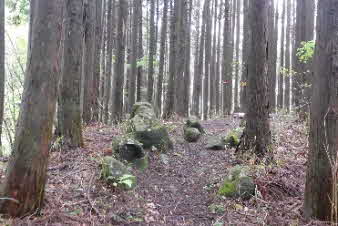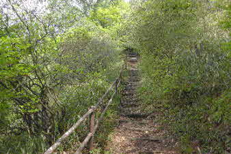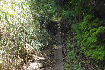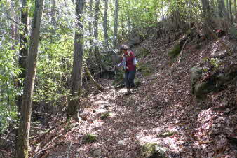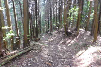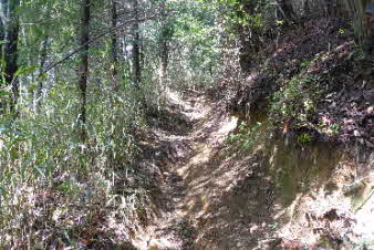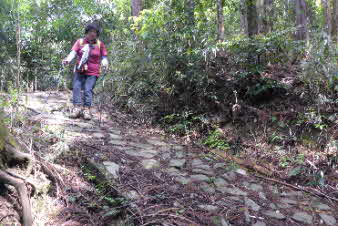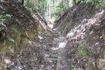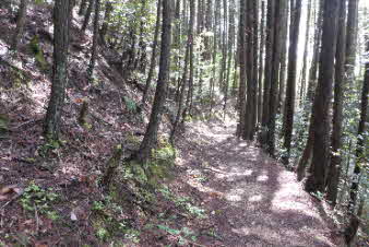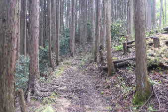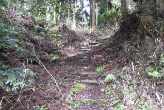 | 高束城址から少し下ると、山道は石畳の道になる。石畳の道は集落の手前までずっと続いている。高束城の登城の道だったのだろうか。 |