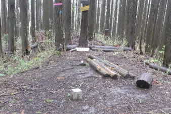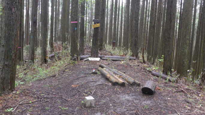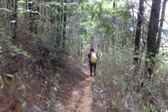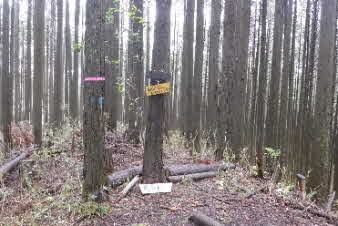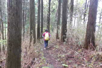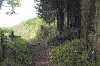 ほぼ平坦な林道を20分歩く、長谷寺への道標があって、山道へと入っていく。最初は、平坦だった山道は次第に急になってくる。標高500mほどのピークに着く、高束城址で消えかかった案内板があった。 |