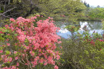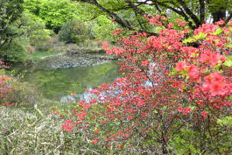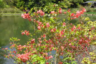 満開のツツジが咲き誇る、勾玉池(まがたまいけ)のベンチで昼食にした。食後、池のまわりのツツジのお花見を堪能した。 |