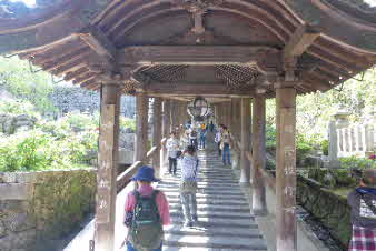 | 仁王門への石段を上がると、登廊がいつもの通り、まっている。今回はスイスイとは登れず、手すりを持って時々、カメラを牡丹に向けて必死で登った。最後の石段の下で思わずベンチに座りこんだ。 |