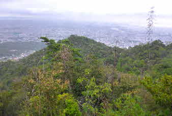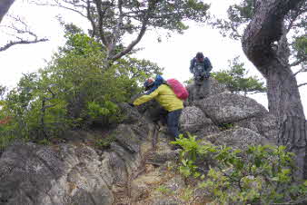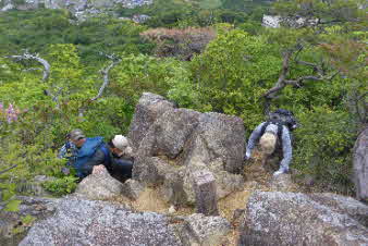 切立った岩や、大きな大きな岩が数枚つながっている。ロープを利用して全員クリヤーした。山頂までもう少しだ。 |