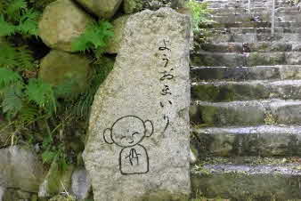 中央の石段を上がると、本堂になる。石段の左手に「ようおまいり」の碑がある。ちょっと可愛い。石段を上がった左の手水舎があり、鷲の口から水が出ている。