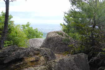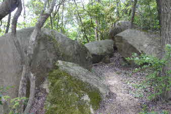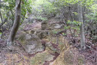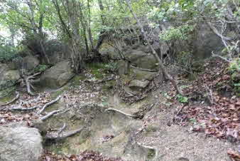 丁度良い具合に岩が展望台になっている。そこからカベノ城を見下ろすことができると思ったのだが、木々が茂って隙間からかろうじて見える程度になっていた。機会があれば、下ってみても良いし、北山公園から登ってきても良いだろう。 |