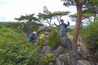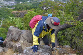 | 山頂から2分ほど尾根を少し下ると、セセラギコースの上の分岐を過ぎる、ここからまた急な岩場が待っている。てっぺんに大きな岩があり、記念写真、スリル満点のところだが写真で見ると変哲もない。観音山より数メートル標高は高そうだ。 |