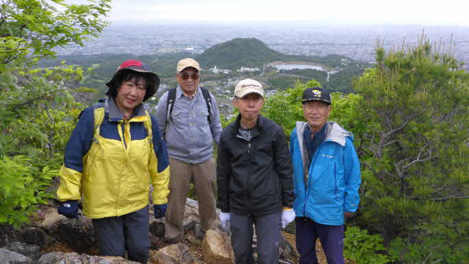 | 展望岩に立って振返ると、素晴らしい絶景が待っていた。展望岩からは360度のパノラマで素晴らしい。北のほうから五月山、石切山など、正面に甲山、その奥に生駒連山、金剛連山そして大阪湾と大阪市街が一望できる。この素晴らしいところで、記念写真を撮った。 |