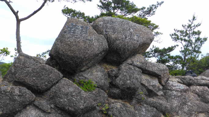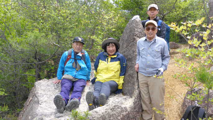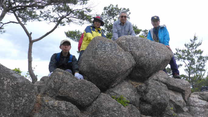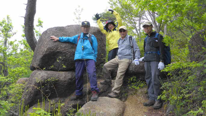 登り切ると尾根頭になり、左上のボコボコした岩の群れが山頂だ。観音山は、標高526nで、岩の上にさらに大きい、おむすびのような岩が2つある。その岩に今消えかかっているが、「観音山」と記されている。その岩で記念写真を撮った。