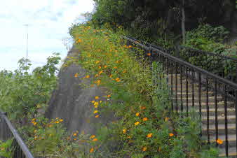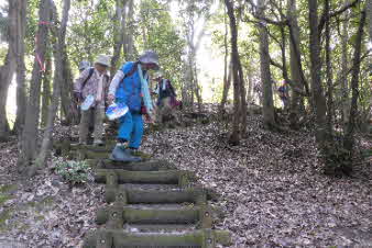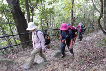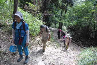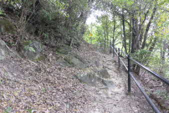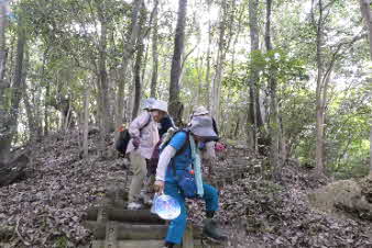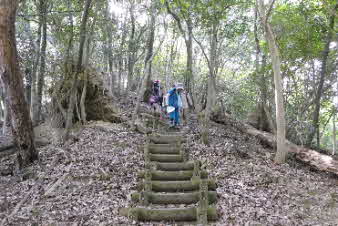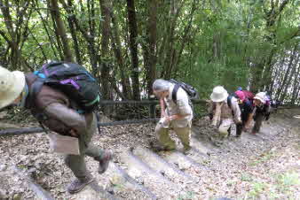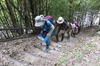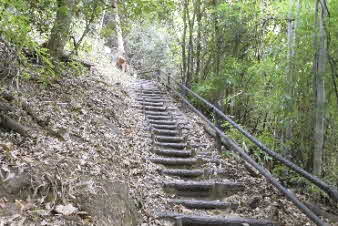 | 登山口からいきなり階段が続く、一歩一歩ゆっくり上がっていく。かなり暑いが、木陰に入ると少し暑さが和らぎ少し安堵した。 |
