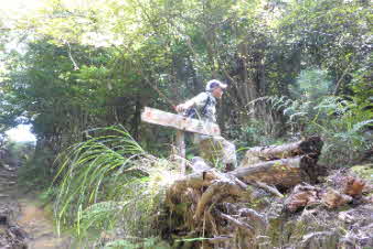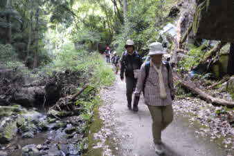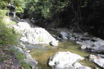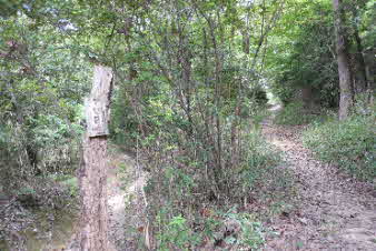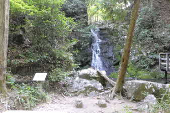 誰もいない、野球場、サッカー場を通り抜け、摂津峡白滝への分岐に到着。ここから白滝を目指して急坂の道を下っていく。道はよく整備されていて、木階段がたくさん作られている。ひたすら下り続けやっと尾根から沢に下り着く。 |