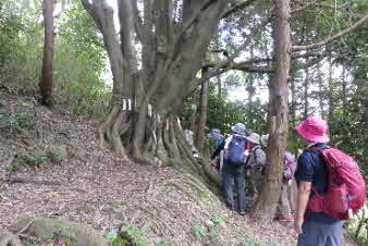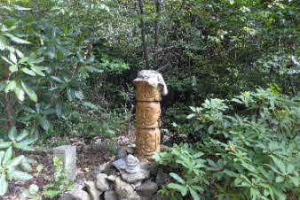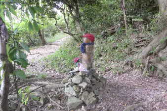 | 阿武山古墳から登山道に戻り、阿武山へと登っていく。アセビ峠への脇道を上っていくと、木彫りのトーテムポールがある。アセビ峠と言うそうだが、春にはアセビの花が咲いている場所だ。 |