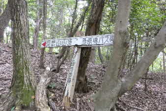 鉄塔広場からかなりの急坂の道を下る。下り終えると、分岐で阿武山口バス停への標識に出る。ここからゆるやかな林道風の道を下っていく。