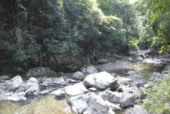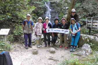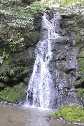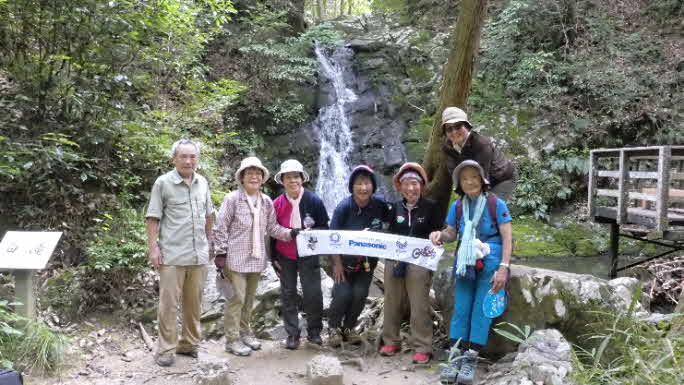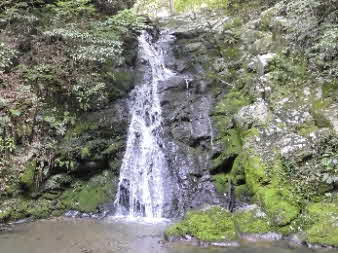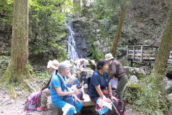 | 総合公園から30分余り尾根道を下り白滝に無事下ってきた。白滝でゆっくり寛いだ。白滝は落差15mほどの余り大きくない滝だ。 |