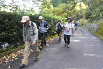 川沿いの道を少し行って、山手の道に入っていった。早速賑やかになった!道端に栗のイガがたくさん落ちていて、栗の実を見つけたのだ。 |