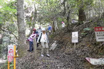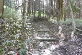 早速、登山口から登り始める。かなり痛んだ石畳の道を登っていくが、そのうちにくぼんだ石畳の道脇に新しい道ができている。この道は、誰かが歩いた跡、多くの人が歩いてできたような道だ。 |