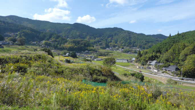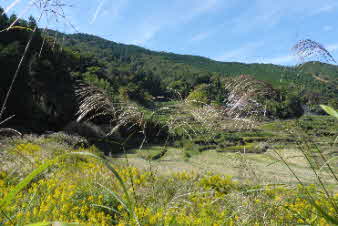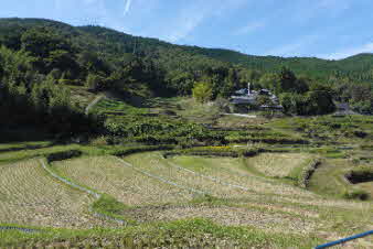 才ノ神峠で昔の隆盛をしのんで下山開始した。帰りのバスの時間もあるので長谷まで行くのをやめて中道を下った。長谷まで行けば棚田がすごく綺麗だのだが、中道からでも美しい光景を楽しみことができた。