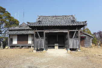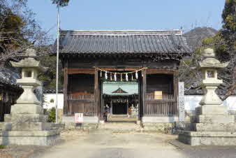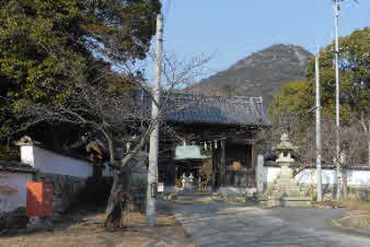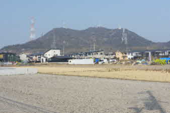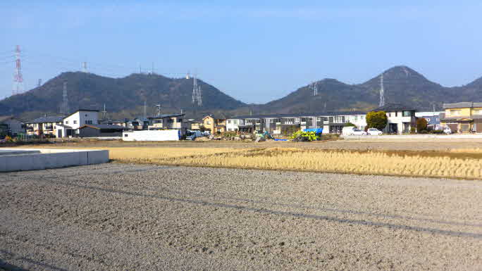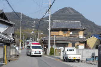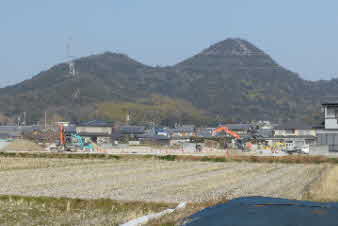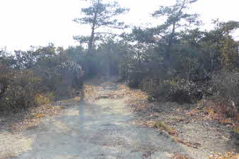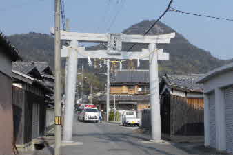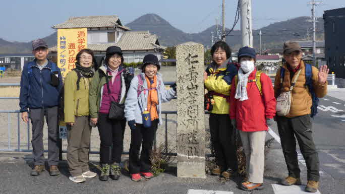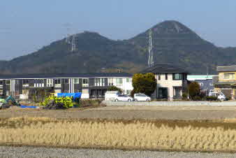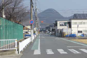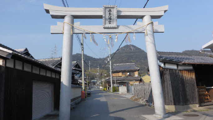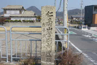 | 北へ北へと道をとり進んでいく。途中広い道路を2回右折れ前進をして進んで行く。仁寿山と小富士山が並んで見えてくる。交差点に仁寿山学問所跡道標がある。ここから北進すると、姫路バイパスの高架下をくぐる。前方に小富士山と麻生八幡社の鳥居が正面になる。 |