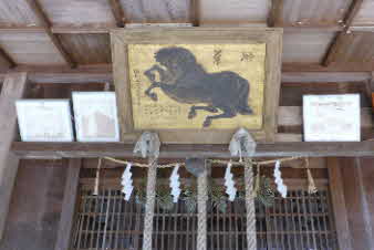 | 麻生八幡宮の鳥居をくぐり進んで行くと、随神門があり、右上に小富士山の頭が見える。境内に入ると、拝殿があり、健康を祈願してお参りする。拝殿には、絵馬がたくさん飾られている。 |