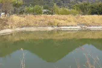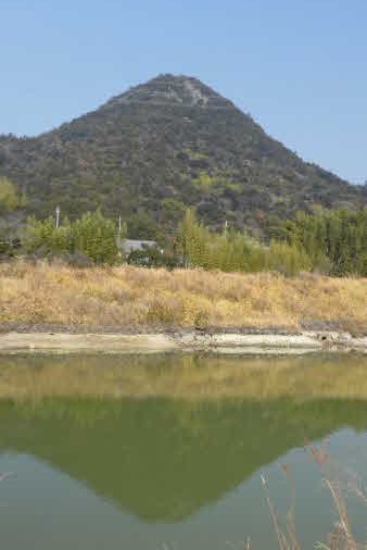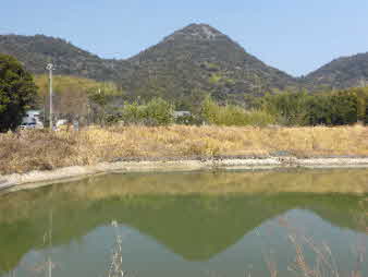 | 八幡宮から右側に出ると、大きな池があり、逆さ小富士山を見ることができる。残念ながらPM2.5が発生していて美しい小富士山は見られなかった。 |