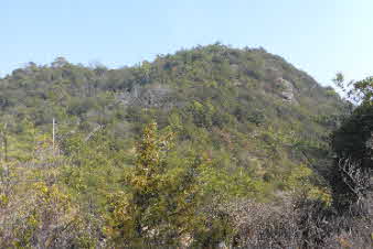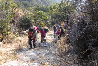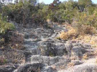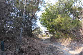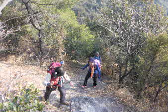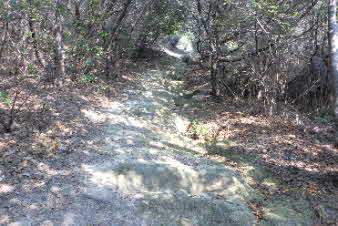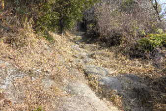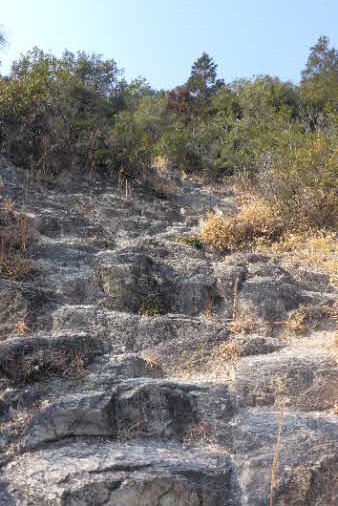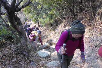 | 山際の民家の左側が登山口だ。登山口を入るといきなり露岩の急登になる。露岩の道は上へ上へ都続いている。頑張って登っていく。 |