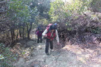 山頂で一時間余り楽しい一時を過ごして、下山開始した。低山ながら富士山の名前のつくので山頂付近の急な登り、急な下りがつきものだ。