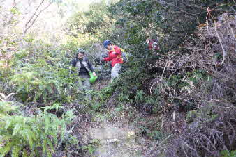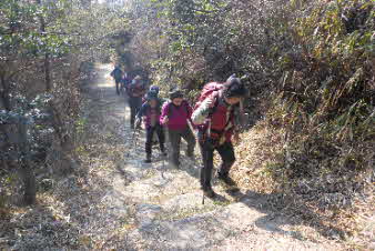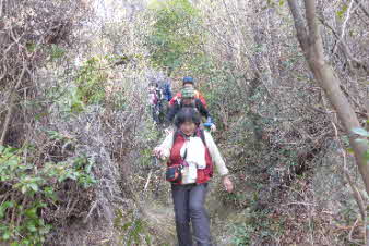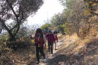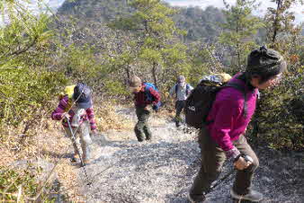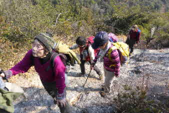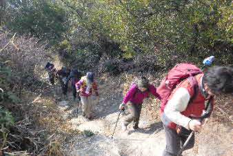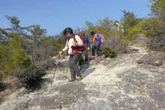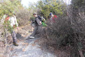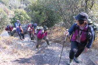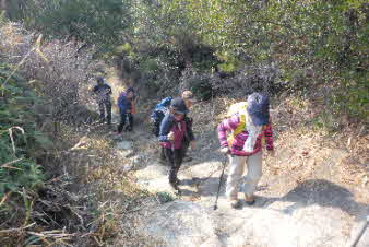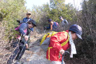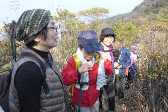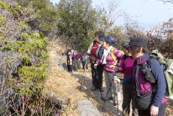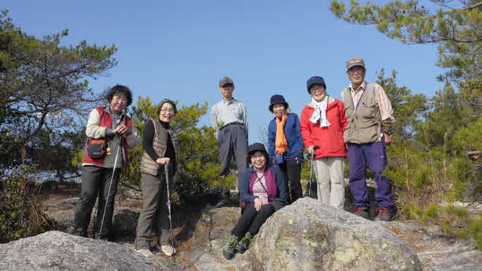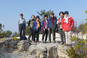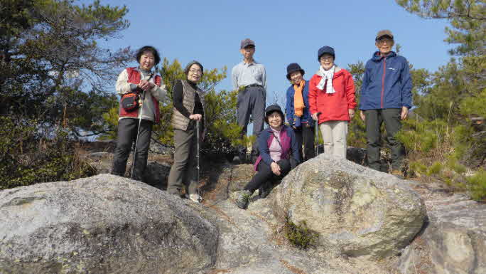 山頂で少し遅い昼食にした。広々した露岩の山頂で火気に細心の注意をして、お膳を温め、うどんをみんなで別け分けして頂いた。寒い中で少しでもほっとすればと考えてだったが、その心配は必要なく、青空でぽかぽか陽気、楽しい一時を過ごすことができた。 |