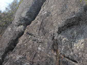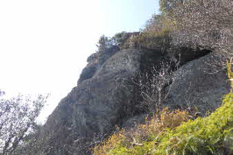 | 頭上に大きな岩が立ちはだかっている。昔の行場で今もクサリが下がっている。行場を登ろうと思ったが危険回避で残念ながらやめて、巻き道を上がった。 |